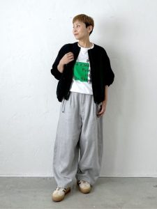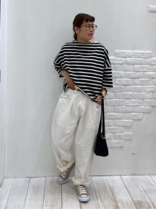 パンツはゆったりとしたシルエットで、リラックス感とこなれ感を両立しています。
