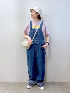 厚みのあるTシャツがラフすぎず、オーバーオールの縦ライン効果でスタイルアップ。