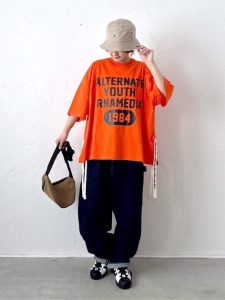 オレンジのビッグTシャツは大胆なプリントが目を引き、サイドスリットデザインが動きやすさを提供しています。