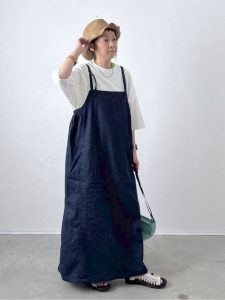白Tシャツにサロペットスカートを重ねた、40代50代女性におすすめの大人カジュアルコーデです。