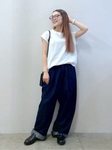 肩まわりを自然にカバーしてくれるフレンチスリーブTシャツは、ワイドパンツとの相性抜群。