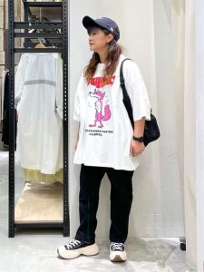 プリント入りのビッグTシャツが、シンプルながらも存在感を放ち、カーゴパンツと合わせることで、動きやすさと快適さを重視しています。