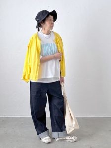 ロゴ入りの白Tシャツに、濃紺デニムを合わせたシンプルスタイルに、ビビッドなイエローカーディガンを肩掛けして、ぐっと華やかな印象に。