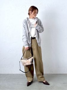 全体をニュアンスカラーでまとめることで、カジュアルながらも上品さを感じるスタイルに仕上がっています。