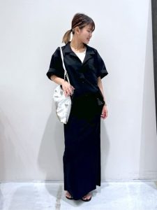 黒シャツに黒スカートというオールブラックコーデは、大人っぽくスタイリッシュな雰囲気を楽しむことができる組み合わせですね。ただし、全身黒を選ぶと重たく暑苦しくなってしまう可能性があります。こちらのように、インナーやバッグに白をプラスすることでオールブラックコーデを軽やかにすることができます。白以外にも、メタリックのシルバーカラーのバッグなども今っぽくて素敵ですよ。アイテム次第で、雰囲気を変えることができますよ。