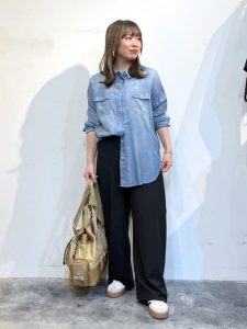2-2.デニムシャツを大人カジュアルコーデに仕上げてくれる黒ボトムス
