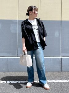 デニム×Tシャツコーデは、春夏の王道カジュアルコーデですね。こんなカジュアルなスタイルをシックに大人っぽく見せたい時は、黒のジャケットやカーディガン、シャツを羽織ってみてはいかがでしょう。ジャケットでは、かしこまり過ぎる時におすすめしたいのがシャツ。シャツは素材感やシルエットにもよりますが、これからのシーズンには羽織りものとしても活躍してくれますよ。シャツは前を開いて羽織るだけで、羽織りとして活躍する優れモノ。