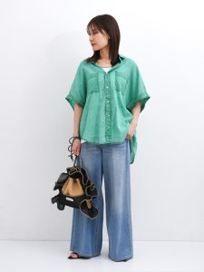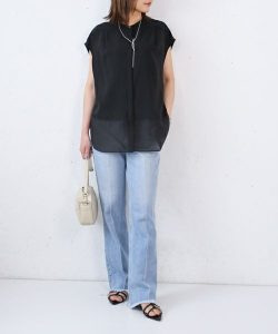ゆったりとしたシルエットのトップスは体のラインをカバーしてくれ涼しく過ごすことができます。ただし、デザインによってはカジュアルになりすぎてしまうので注意が必要です。こんな時も、このようなセミフレアシルエットを選ぶことで大人っぽくスタイリッシュなコーディネートにつなげることができます。春夏のシンプルコーデの時には、アクセサリーを多めにプラスしたり、ヌーディなサンダルの足元にするのも女性らしさを楽しめるコツですよ。