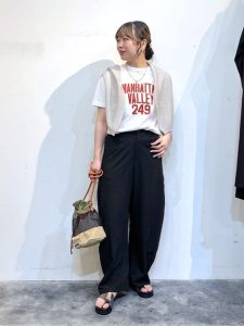 春夏アイテムとして定番となっているロゴTシャツは、デザインやカラーによってはカジュアル感が強くバランスが難しくなるアイテムです。こんなロゴTシャツは、白や黒といったモノトーンを選ぶことでボトムスを選ぶことなくスッキリとした見た目に仕上げることができますよ。黒のボトムスを選ぶことで、コーディネート全体をスッキリ見せることにつながり、大人のカジュアルコーデとして楽しめる組み合わせなのではないでしょうか。