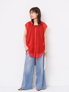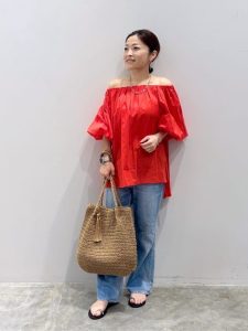 1-1.明るい陽射しに映える赤のトップスは気分次第でワンショル、オフショルで楽しめる