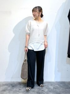 透け感を楽しめる和紙ニットプルオーバーはインナーの選び方次第で、手軽にコーディネートの雰囲気を変えて楽しめるアイテムです。ニットと同系色のアイテムとレイヤードすることで、すっきりとした感じに仕上げてエレガントなスタイルが完成しますね。足元やバッグなど小物の選び方次第で、カジュアルだけではなく、きちんとしたシチュエーションにも対応することができるコーディネートに仕上げることができます。夏場のおすすめコーデのひとつ。