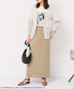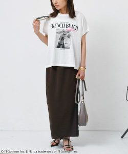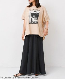 こちらは、1936年から2007年の長きに渡りアメリカで出版されたグラフ雑誌「LIFE(ライフ)」のTシャツです。モノクロフォトがスタイリッシュな雰囲気を楽しむことができる1枚。フォトTシャツなどインパクト強めのアイテムは、バランスよく組合わせることでトレンド感と大人っぽさを楽しむことができます。カジュアルTシャツを女性らしく落ち着いた雰囲気で手軽に楽しみたい時、マキシ丈スカートとコーディネートしてみてはいかがでしょうか。