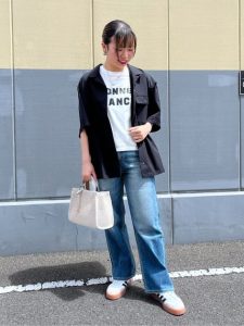 定番のジャケットでは、きちんと感が強くなってしまうのでオーバーサイズのアイテムが良いでしょう。オーバーサイズのジャケットは落ち感を楽しむことができ、ほどよく綺麗めなシルエットと大人っぽい雰囲気を加えてくれます。カジュアルなTシャツは手軽に今っぽい雰囲気になりますが、幼くなってしまうのがデメリット。カジュアルなボトムスを選ぶと、部屋着感が強いコーディネートになります。バランスのよいテイストを選ぶことでお洒落になります。