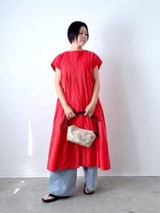 鮮やかな赤のワンピースを主役に、デニムパンツをレイヤードした夏のワンピースコーデ。