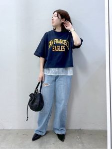 ネイビーのロゴTは落ち着いた印象を与えつつ、白いレイヤードインナーをチラ見せすることで抜け感をプラス。