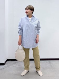 爽やかなブルーのゆるトップスに、ベージュのテーパードパンツを合わせた、大人のきれいめカジュアルコーデ。