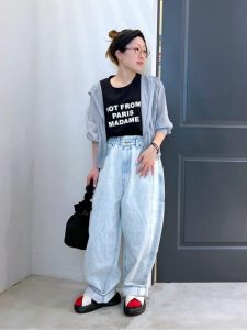 白のロゴTシャツとワイドパンツを合わせ、抜け感を演出しつつも上品にまとまっています。