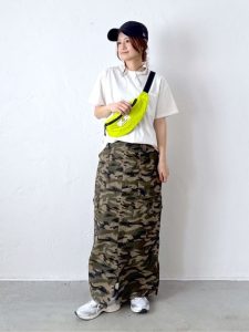 白Tシャツをベースに、迷彩柄のスカートを合わせたアクティブ感のあるカジュアルコーデ。