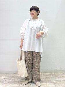 ふんわりとした白のチュニックブラウスに、小花柄のリラックスパンツを合わせた、大人の余裕を感じさせるナチュラルコーデ。