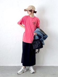 鮮やかなピンクのオーバーTに、すっきりとしたシルエットのスリムスカートを合わせた大人のバランスコーデ。