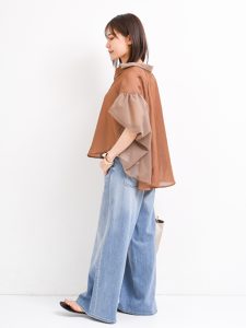 2-1.甘めテイストのフレアスリーブはシンプル、カジュアルなデニムとスッキリまとめる