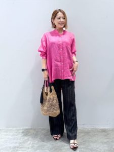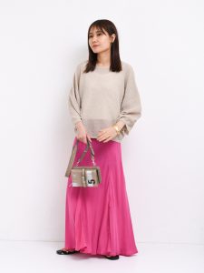 ピンクカラーは、大人可愛いコーデ作りにピッタリです。ピンクには、くすみ系からビビットな色調まで、多くのカラーがあります。このようなピンクですが、素材感によっても理想の雰囲気に近づけることができます。こちらは、透け感を楽しめる和紙ニットプルオーバーです。透け感のあるアイテムは、インナーに選んだカラーによってもピンクの見え方を変えることができます。白やベージュなど落ち着いたカラーを選ぶと控え目な雰囲気を楽しめますよ。