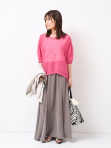大人可愛い雰囲気を楽しめるピンクカラーのトップスには、落ち着いた雰囲気のベージュのスカートを選んでみてはいかがでしょうか。着丈長めのスカートは、コーディネートしたときにも広めの面積なので全体を落ち着いた印象に見せることができます。ベーシックカラーのボトムスは春夏に増えるカジュアルテイストのアイテムを、落ち着いた雰囲気に仕上げることができる優秀なアイテムです。シンプルですが、コーディネートする時に便利な1枚ですよ。