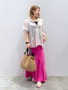 スカートを選ぶ時は、着丈長めのマキシ丈を選んでください。マキシ丈のスカートは、抜け感あるスタイルや今っぽい雰囲気を手軽に楽しむことができます。スカートを選ぶ時、シルエットによっても雰囲気を変えられます。フレアーやギャザーシルエットよりボリューム控え目のタイトシルエットを選ぶことで、より女性らしくスタイリッシュな雰囲気を楽しめるのでおすすめですよ。風通りがよく、コーディネートしやすいスカートはおすすめのアイテムです。