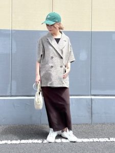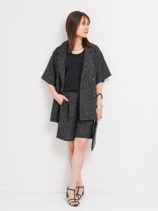 こちらのジャケットは、テーラードデザインなのでジャケット感は残しつつ、かっちりしすぎない絶妙な雰囲気が魅力のアイテムです。袖のバランス、綺麗なシルエットが際立つダブルジャケット。ややドロップショルダーのシルエットやゆったり感が、こなれた大人のカジュアルスタイルを手軽に楽しむことができる1枚です。今回は、同素材のハーフパンツでのカジュアルすぎないセットアップコーディネートに仕上げています。今っぽくおすすめの1枚です。