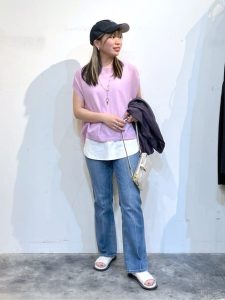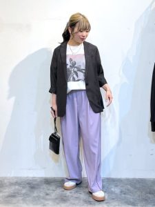 明るいラベンダーカラーのボトムスを選ぶことで、女性らしさをプラスしています。パステルカラーのアイテムは、甘くなってしまう可能性があるため辛口アイテムとコーディネートすると良いでしょう。甘辛MIXな雰囲気となるので、センスのよい大人カジュアルとして楽しめますよ。足元をスニーカー、サンダルなどアイテムを変えるだけでも雰囲気が変わるため上手にコーディネートしてみてくださいね。