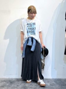 カジュアルなフォトTシャツを、大人っぽく楽しみたい時マキシ丈スカートやワイドパンツがおすすめ。落ち感ある素材を選ぶことで、ゆるっと綺麗めな大人カジュアルスタイルを楽しむことができます。着丈長めのシルエット、柔らかな素材のボトムスは、落ち着いた雰囲気を手軽に楽しむことができるアイテムとして1枚あると便利ですよ。綺麗めからカジュアルスタイルまで、幅広く楽しむことができます。