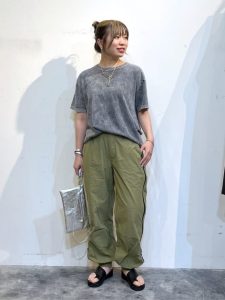 こちらは、カジュアルな雰囲気のカーキカラーのボトムスです。カーキカラーのアイテムは、カジュアル感が強くメンズライクになってしまうこともあります。この時、パンツのシルエットを上手に選ぶのがおすすめ。ワイドやテーパードパンツなどは、綺麗めスタイルに近づくことができるためカジュアルなアイテムを大人っぽく楽しめます。カジュアルなアイテムは、バランスがポイントになりますね。