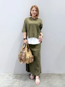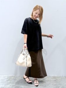 オーバーシルエットのアイテムを選ぶことで、風通りもよく涼しく快適な着心地につながります。リネンやコットンなど自然素材のアイテムを選ぶことで、機能面とお洒落の両方を選ぶことができるでしょう。エレガントになりすぎるスカートコーディネートの時に、Tシャツを選ぶことでカジュアルダウンにつながり今っぽいスタイルを楽しめます。落ち着いたカラーを選ぶと大人ぽい雰囲気を楽しみましょう。