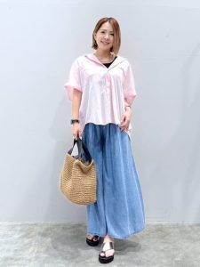 デニムは手入れが簡単なので、暑い季節にピッタリなアイテムです。甘めテイストのデザインやカラーもデニムを選ぶことで、大人っぽいコーディネートに仕上げて楽しむことができます。暑い季節は、シンプルなTシャツを使ったスタイルが増えますよね。ゆったりとしたシルエットのボトムスを選ぶことで、涼しさとエレガントで大人っぽい雰囲気を楽しむことができるのではないでしょうか。