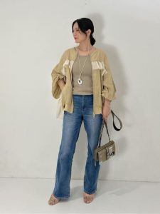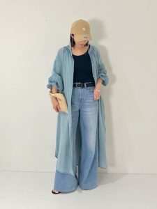 カジュアルなイメージのデニムスタイルですが、シャツスタイルや羽織りをプラスすることで上品で綺麗めな雰囲気を楽しむことができます。シャツや羽織りを選ぶ時、カラーや素材、シルエットの選び方によっても雰囲気が変わりますよ。暑い日は、室内と屋外の気温差があるため空調対策として薄手のシャツや羽織りがあると便利です。シャツや羽織りは、きちんと感ある雰囲気に見せることが得意です。