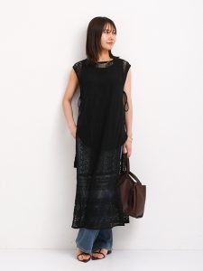 こちらは、ヴィンテージ感のあるレースが使用されているロングジレワンピース。サイドにざっくりとスリットが入り、抜け感のあるレイヤードコーデを楽しめます。裾部分にパッチワークがデザインされていてアクセントになり、透かし柄がトレンド感をプラスしています。甘めのレースはブラックカラーを選んで、シンプルにデニムコーデを選ぶことで今っぽい雰囲気を楽しめるのではないでしょうか。