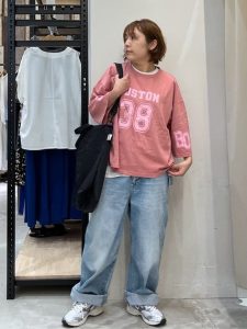 ピンクのロゴTシャツは程よく存在感がありながら、フェード感のある色味で派手すぎず、40代・50代・60代の方にも取り入れやすい一枚。
