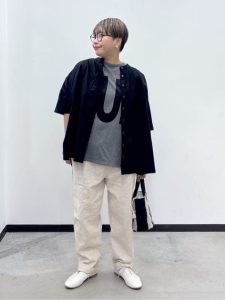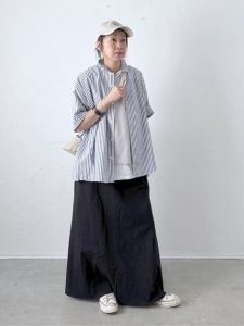 全体に抜け感があり、動きやすさも兼ね備えた夏に最適な大人コーデです。