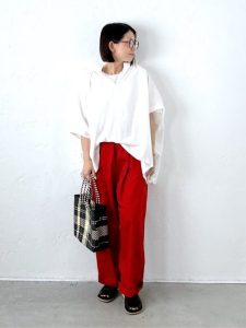 パンツの赤がアクセントとなり、シンプルながらも華やかさを演出しています。