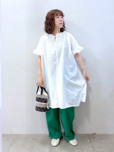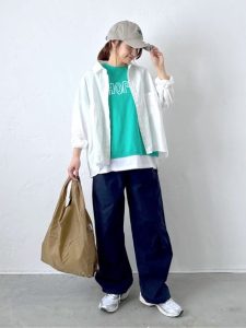 白×グリーンの爽やかな配色が、夏らしく元気な印象を与える、涼しさとこなれ感を兼ね備えた大人のコーデです。