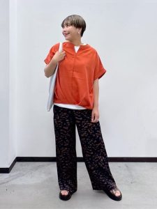 鮮やかなオレンジのトップスと、さらりとした素材感の柄パンツが印象的な夏のコーディネート。