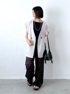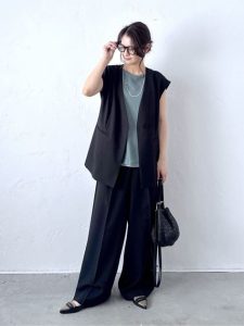 涼しげな素材のノースリーブジャケットとワイドパンツを合わせた、きちんと感とリラックス感のバランスが絶妙なスタイルです。