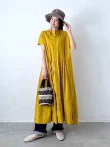 華やかなマスタードイエローのワンピースが目を引く、40代・50代・60代におすすめの夏コーディネート。