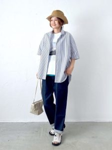 帽子やサンダル、小さめバッグで抜け感をプラスすれば、こなれたカジュアルスタイルが完成します。