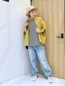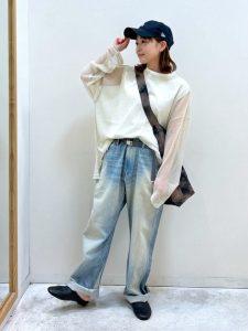 ゆったりとしたデニムパンツと合わせることで、動きやすさとリラックス感を両立させています。