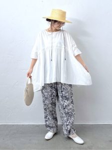 ボリューム感のある白のプルオーバーは、ゆったりシルエットで体型をさりげなくカバーしつつ、涼しげでリラックス感のある着こなしに。