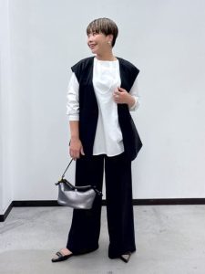 黒のジレとワイドパンツのセットアップ風スタイルに、白のプルオーバーを合わせて抜け感と清潔感をプラス。