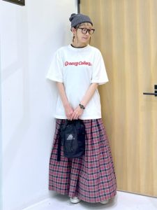 ロゴ入りの白Tにチェック柄のロングスカートを合わせることで、カジュアルながらも落ち着いた印象に。