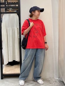 画像では、鮮やかな赤のプリントTシャツが主役。