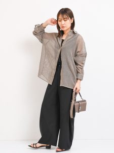 トレンド素材やカラーをコーディネートに取り入れたい時、ボトムスをブラックにすることで落ち着いた雰囲気を楽しめます。スリムなパンツは、カジュアル感が強く、身体のラインを拾ってしまうデメリットがあります。ゆったりシルエットを選ぶことで、風通りもよく涼しく快適に過ごすことができます。コットンやリネンなど、天然素材を選ぶことも上質な雰囲気につながるのでおすすめですよ。